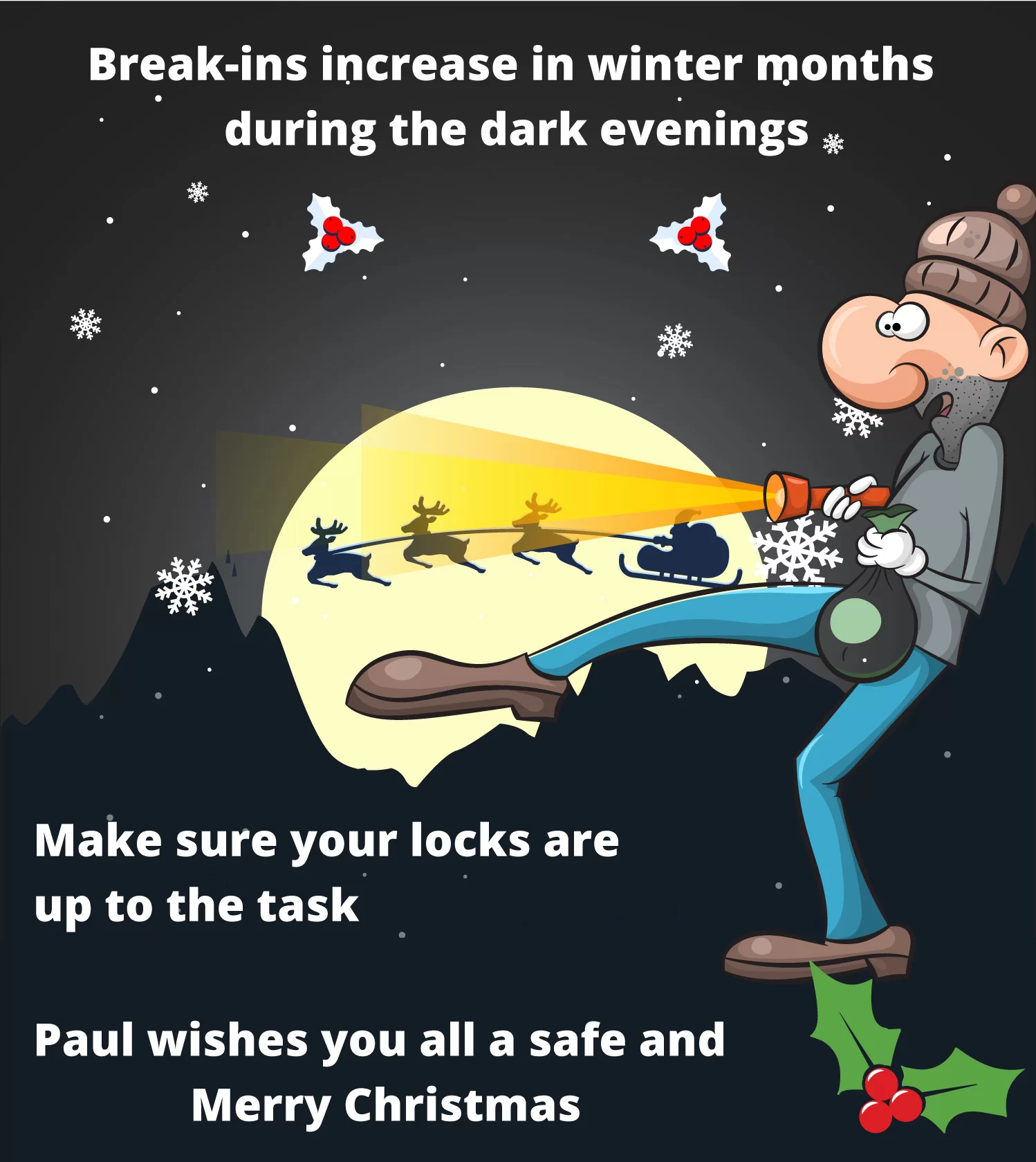 Have a safe and wonderful Christmas and if you are worried or unsure or have suffered a burglary, call me, Paul, on 07873 610131